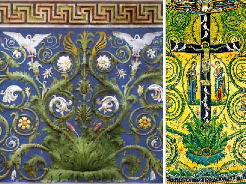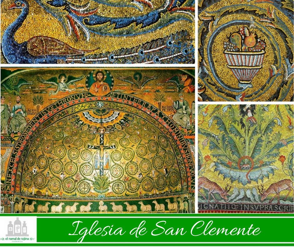 A 300 metros del Coliseum se erige una de las iglesias más antiguas de Roma, la iglesia protocristiana de San Clemente. San Clemente fue el tercer papa de la iglesia y el que instauró la costumbre de cambiarse el nombre porque el suyo no podía ser más pagano, Mercurio. En su ábside podemos constatar cómo fueron cristianizados estas costumbres romanas y podemos observar como la Cruz de Cristo brota de un Acanthus sustituyendo al concepto del árbol de la vida y que a su vez hace de eje de multitud de revolutas. Las revolutas son en este caso de vid en una clara alusión a la sangre de Cristo. De la Cruz mana un río que se divide en cuatro cursos de agua, los ríos Fison, Tigris, Geon y Eufrates que van a regar el paraíso y al mundo entero. En el mosaico encontramos palomas que simbolizan el alma, animales que apagan su sed en los cuatro ríos. El cisne cantor romano es sustituido en su ápice por el ave Fénix que renace de sus cenizas, con la Mano de Dios sujetando la corona de Rey y el Chrismón o monograma de Cristo.
