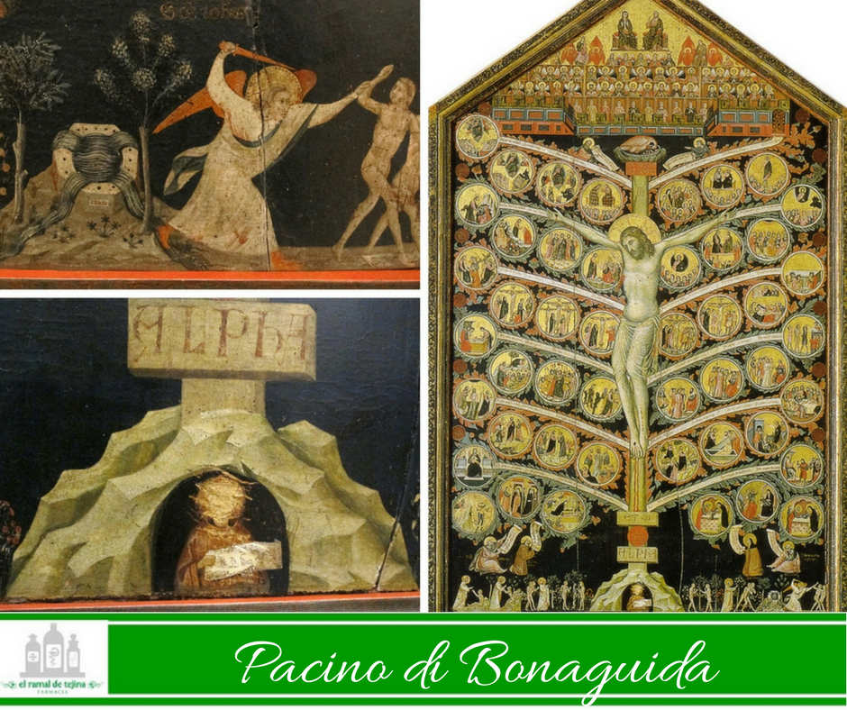 San Buenaventura tiene entre sus obras el Lignum Vitae, el árbol de la vida o el árbol de cristo un directorio de la vida espiritual o mística que tuvo una gran influencia en el arte de la época. Con una evidente finalidad didáctica se imagina un árbol dividido en tres partes en cuya base se sitúa el origen, en el medio la pasión para terminar con la glorificación. De cada una de las partes salen cuatro ramas cada una de ellas con una estrofa, hasta componer un total de doce de los que parten sus respectivos frutos. Esta obra tuvo multitud de interpretaciones artísticas. Pacino di Bonaguida crea un imponente árbol de la vida o de la Verdadera Cruz en la que desarrolla sobretodo la parte media de la pasión. Cristo aparece en la Cruz coronado con un pelícano que viene a representar la redención de los hijos utilizando la sangre del padre. El pelícano había sido ya utilizado por San Agustín ya que era capaz de lesionarse a sí mismo para con su sangre alimentar a sus crías. La simbología del pelícano fue muy utilizada hasta nuestros días, la podemos contemplar por ejemplo en la Sagrada Familia muy acorde con la arquitectura orgánica de Gaudí.